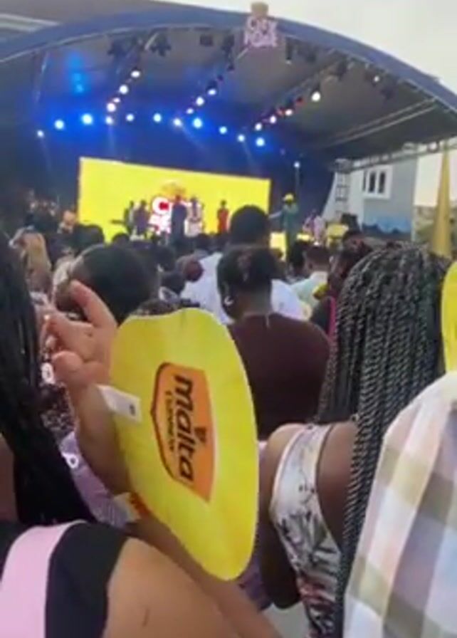stage from the perspective of someone in a crowd. The stage has a large screen behind it, and people are standing on the stage. There are several rows of people in front of the stage, holding yellow fans with a Guinness Malta logo. The stage has lighting rigs on top. The environment is outdoors. A man on stage dressed in green points towards the crowd. The speaker says "Last question, last question, last question please."