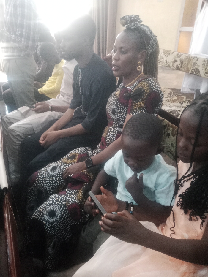 The image displays an indoor gathering, likely within a residential or event space in the city of Jos, Nigeria; the precise location is not visually identifiable