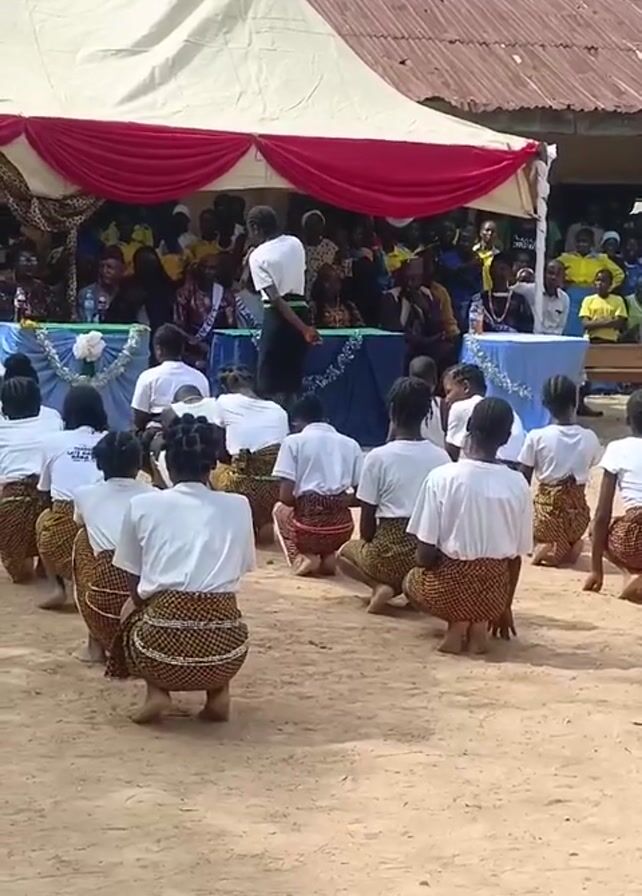 group of young girls in an outdoor setting. They are arranged in rows, kneeling on the ground. They all wear white shirts and traditional patterned skirts. In front of them, a slightly older girl stands, apparently leading or directing them. Behind the girls, under a large tent, a crowd of people is seated, observing the scene. The environment is a sandy or dirt area, likely a schoolyard or similar public space. The tone seems to be celebratory or ceremonial, with the group of girls likely performing a dance or cultural presentation for the audience.