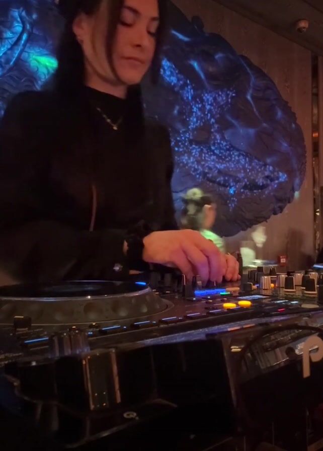 A young female DJ is performing in a nightclub. She is wearing a black long-sleeved shirt, headphones, and a necklace. She has dark hair with a light-colored streak. Her hands are on a black DJ mixer, adjusting the levels and effects. Behind her is a large, carved, illuminated wall decoration with a blue glow. The environment is dimly lit and appears to be a stylish or upscale venue.