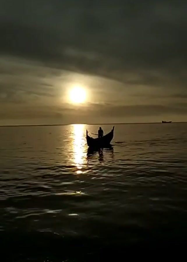 person in a small, traditional-looking boat, silhouetted against a bright, almost obscured sun. The boat is moving across the water, with the person possibly rowing. The water reflects the sunlight, creating a golden path towards the horizon. The sky is filled with clouds, darkening the overall scene. A larger ship is seen in the distance. The scene evokes a sense of solitude and tranquility.