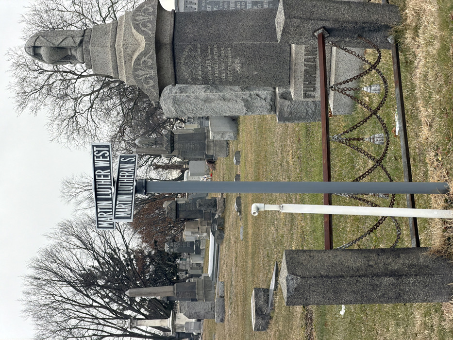 - "A cemetery scene features a street sign indicating "Martin Luther West" and "Martin Lutheran S"" by FM-AJf9d2, licensed under CC BY 4.0