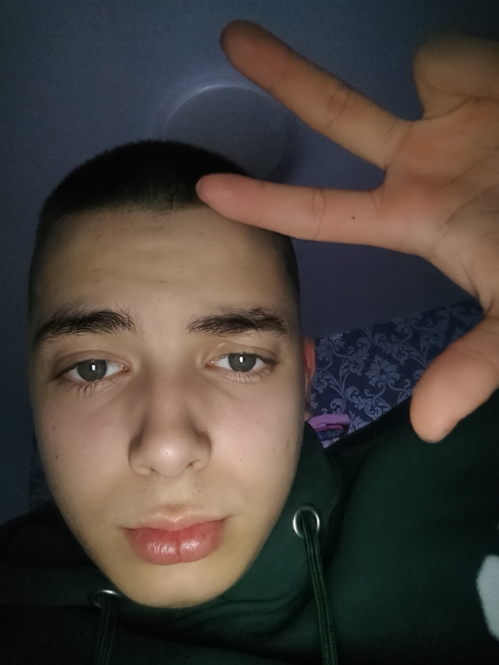 The scene depicts a close-up, head-and-shoulders portrait of a young male with light skin, short dark hair, and light eyes, taken indoors within what appears to be a private residence in Sofia, Bulgaria. He wears a dark green hooded sweatshirt with visible drawstrings. His right hand is raised to the upper right, with the index and middle fingers extended upwards in a 'V' gesture, partially obscuring the upper portion of his head. He gazes directly at the viewer. The background on the right features a wall with dark blue wallpaper patterned with a lighter floral or damask design. The ceiling is plain and light-colored, exhibiting a circular indentation or recessed light fixture towards the top center. The lighting is low-key, primarily illuminating the subject's face from the front.