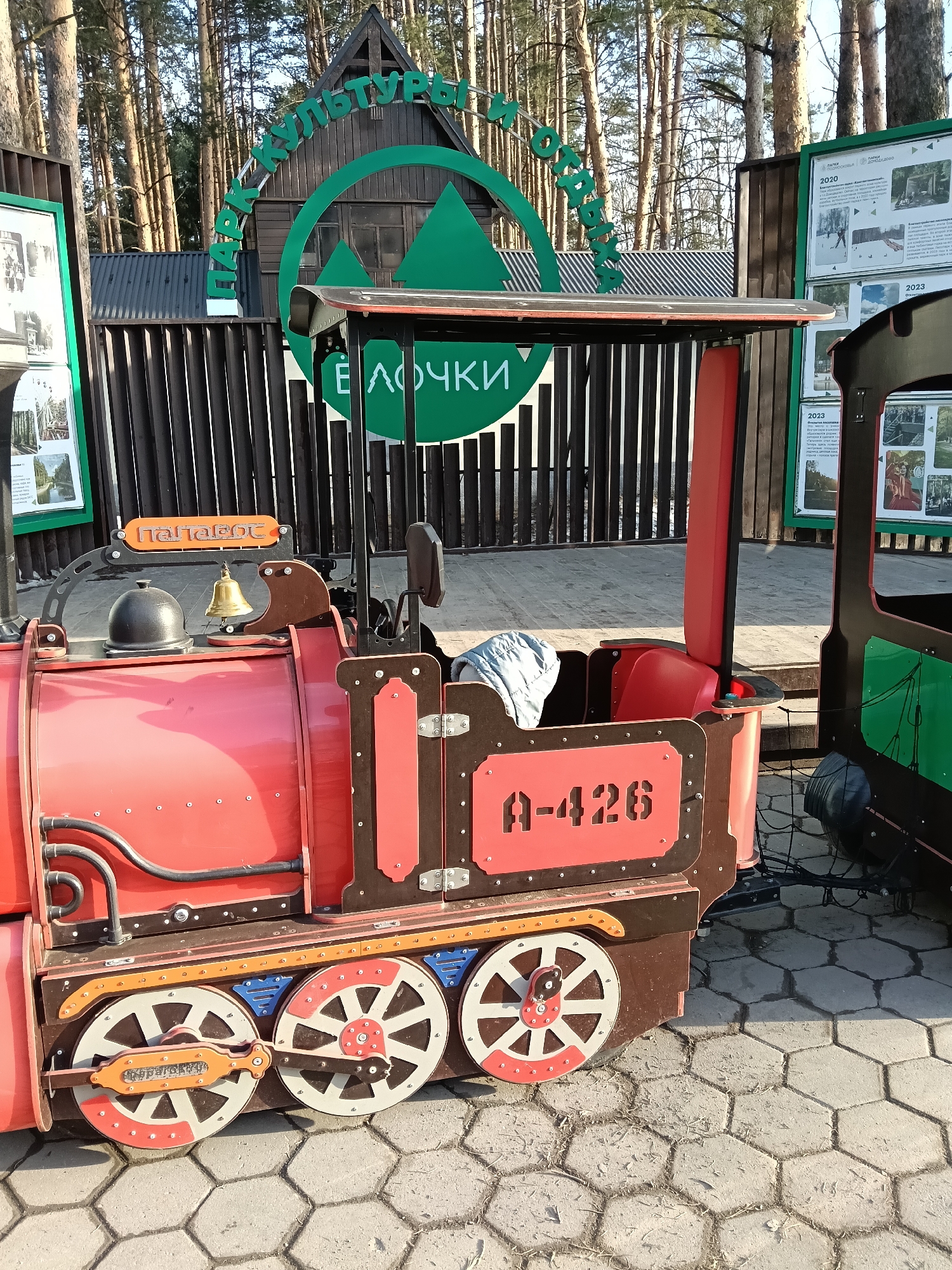 The image displays a static outdoor scene within Yolochki Park of Culture and Leisure, located in Domodedovo, Russia. In the foreground, a miniature children's train engine, predominantly red with brown and black details, rests on a hexagonal concrete paver surface. The engine features a brass bell, a black dome, decorative wheels with white and red segments, and black tubing. A sign on the front reads "ПАЛАВОС" (PALAVOS), and a side panel displays "A-426". The open cab contains a red seat, partially covered by a light blue garment. To the right, a portion of a second, green and black train car is visible, connected to the engine by a black mesh coupling. In the mid-ground, a wooden building with a steeply pitched roof is situated behind a brown wooden fence. A large green circular sign on the building prominently features "ПАРК КУЛЬТУРЫ И ОТДЫХА" (Park of Culture and Leisure) and "ЁЛОЧКИ" (Yolochki), confirming the location. Flanking the building are two tall, green-framed information boards displaying text and images, with visible dates including "2020" and "2023" on the right board. The background consists of a dense forest of tall, slender pine or conifer trees under a clear sky. No individuals are present in the scene. The lighting suggests natural daylight, with shadows indicating a low sun angle.