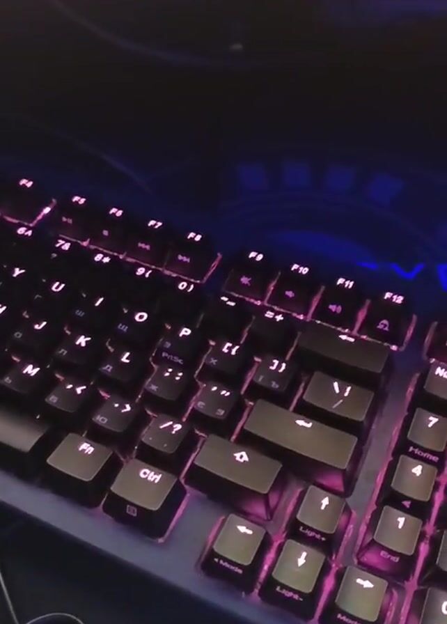 person playing Counter-Strike 2 on an ASUS monitor. The keyboard is a gaming keyboard with pink backlighting. On the screen, the game displays a team of terrorists, wearing balaclavas, brown pants, and white vests, standing in a group before the round starts. The game interface shows "First half. You are starting as terrorists" at the top. The player names and scores are also visible.