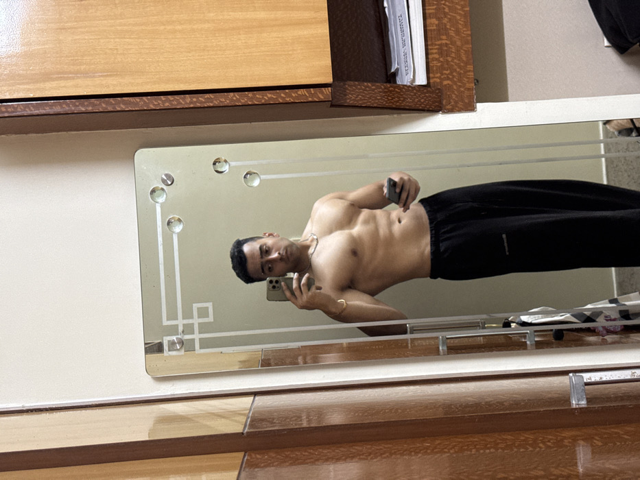 A male individual, shirtless and displaying a muscular physique, stands in an indoor setting in Kolkata, India, taking a mirror selfie