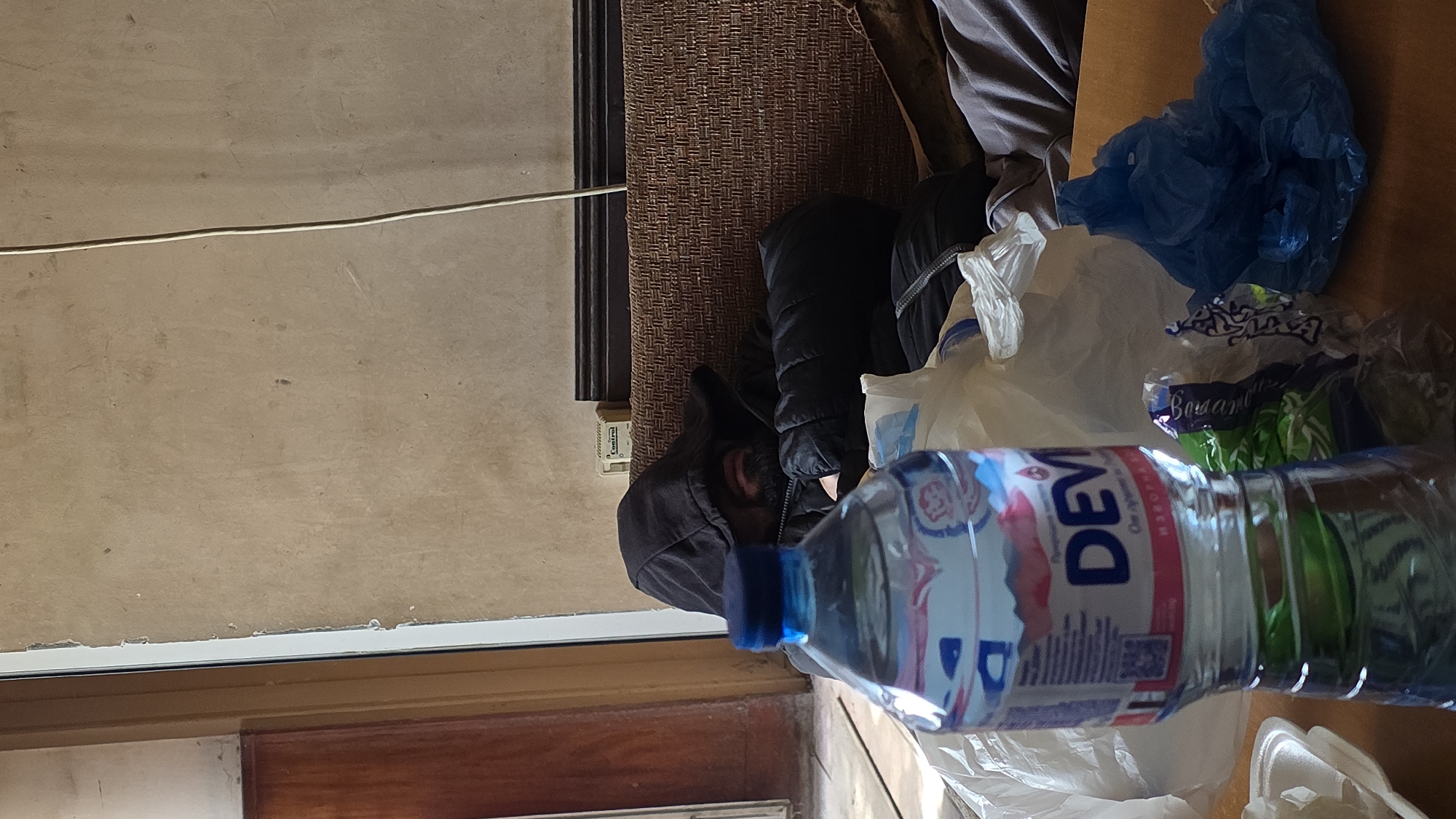 n indoor scene. In the foreground is a partially filled plastic bottle of Devi water, with a predominantly white and pink label. Behind the bottle are multiple plastic bags, some clear and some blue. A person wearing a black hooded jacket is visible near the bags. The scene is located in Balgarevo, Bulgaria. The background includes a wall, a rug, and part of a wooden surface.