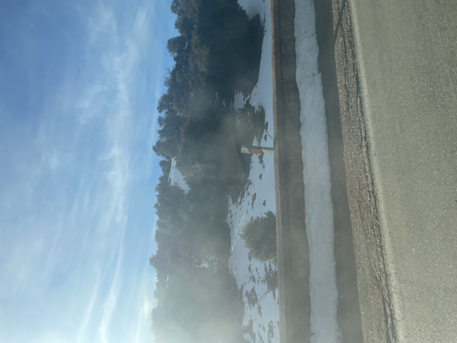 The image captures a winter scene in Ait-Oufella, Morocco, depicting a mountainous landscape under a clear blue sky with wispy clouds