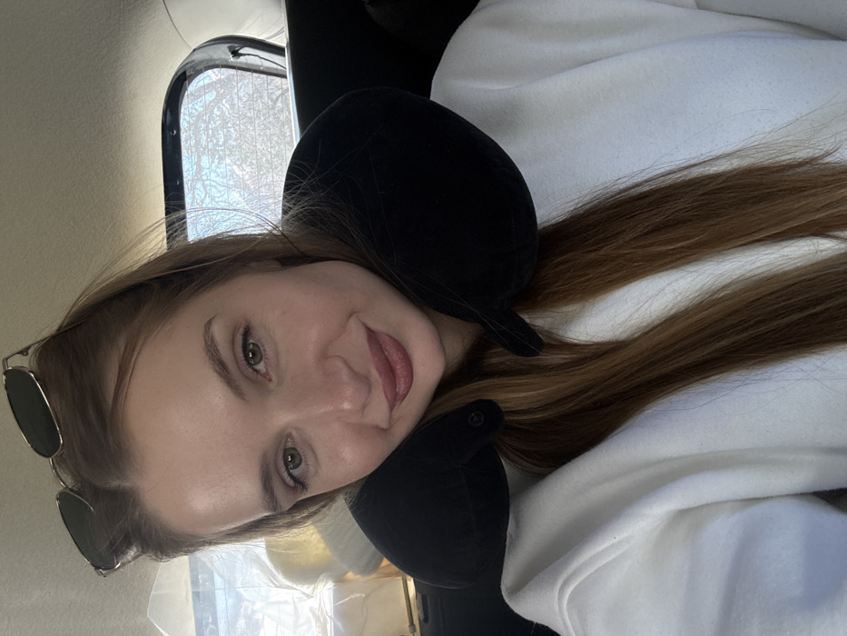 A female individual is seated within a vehicle, located in Grabovica, Montenegro. She is positioned towards the center of the frame, looking directly at the viewer with a slight smile. Her long, straight, light brown hair falls over her shoulders. Sunglasses with dark lenses and a metallic frame are perched on top of her head. She wears a white long-sleeved top or sweater and a black U-shaped travel neck pillow. The vehicle's interior features dark elements. Through the rear window, a blurred outdoor scene with tree branches against a bright sky is visible. A white, possibly textile, object is partially visible in the blurred background to the left.