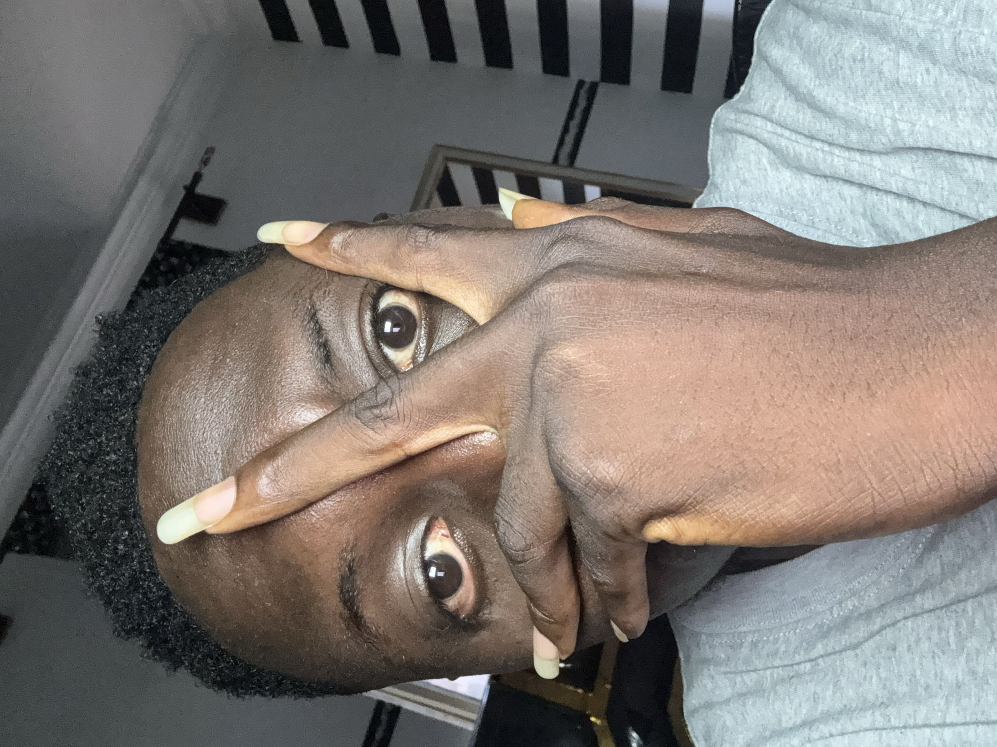 A close-up, frontal portrait shot captures an individual with dark skin and short, dark, curly hair, located indoors in Lafia, Nigeria. The subject's left hand is positioned across their face, with fingers splayed, obscuring the nose, mouth, and a portion of the left eye and forehead. The visible fingernails on the left hand are notably long, exhibiting pale yellow or light green coloration at the tips. The subject's right eye is fully visible and directed towards the viewer; the sclera shows minor redness. The individual is wearing a light grey, possibly heathered, short-sleeved garment. The background on the right side features a wall with distinct horizontal black and white stripes. To the upper left, a dark, reflective surface is partially visible. The ceiling is light-colored.