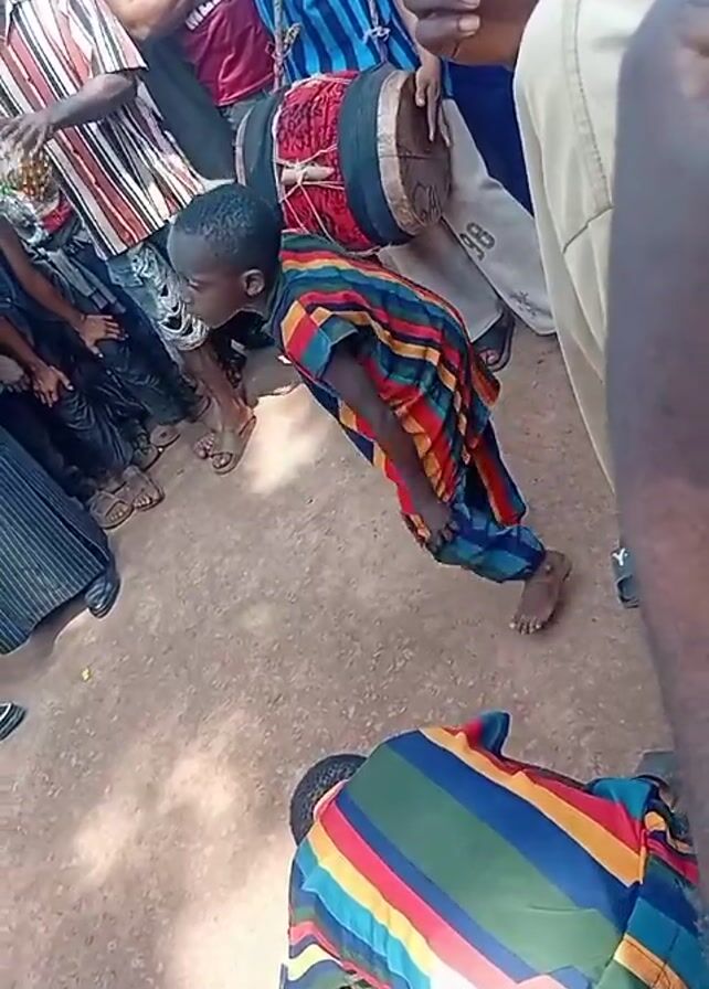 A medium, high-angle shot of a group of people gathered in what appears to be a public space. Two young boys, both wearing striped outfits, are central to the action. One boy is bending over with his hands on the ground, while the other stands nearby, seemingly about to take a step over him. Several other people stand around them in a circle, with some appearing to be observing the scene. One man is drumming on a traditional drum, which is strung around his body. The environment appears to be outdoor, with a reddish, dirt-like ground visible. The lighting is natural, with shadows cast by the surrounding people.