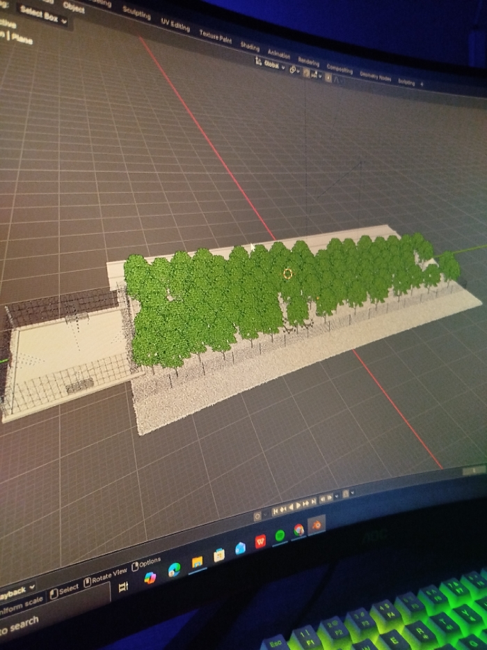 The image displays a curved computer monitor featuring a 3D modeling software interface, likely depicting a planned or existing area within Mirovyane, Bulgaria. The central subject on the screen is a digital 3D model comprising a linear arrangement of numerous green, deciduous-style trees. These trees are situated on a light-colored, textured surface, resembling a sidewalk or ground cover. To the immediate left of this treelined section, a rectangular, lighter-toned paved area is visible, bordered by wireframe elements suggestive of a fence or barrier. The model is presented against a dark gray grid background, typical of 3D design environments, with a prominent red axis line. Portions of the operating system's taskbar with various application icons are visible at the bottom of the screen. Below the monitor, a section of a keyboard with illuminated green backlighting is partially visible. No individuals are present or depicted within the scene.
