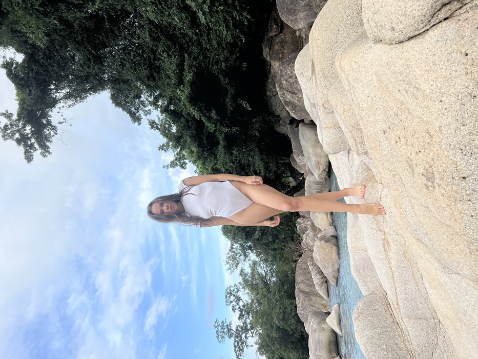 An outdoor scene captures a single female subject standing barefoot on a large, smooth rock formation, with a body of water and dense vegetation in the background