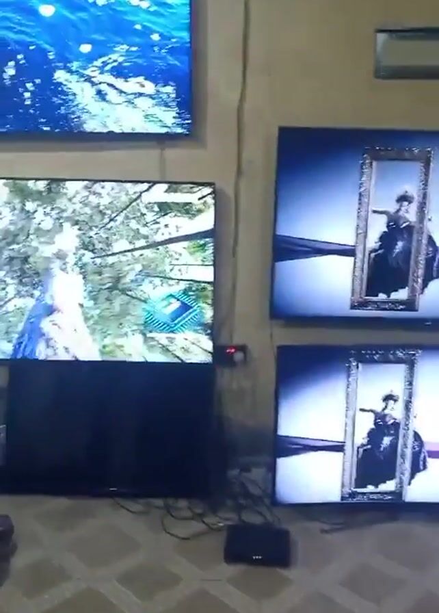 room with multiple large televisions mounted on the walls. The televisions display various images, including scenes of water, trees, and a portrait. Below the televisions, there are speakers, a CD player, and some boxes. The floor has a tiled pattern. The room is cluttered.