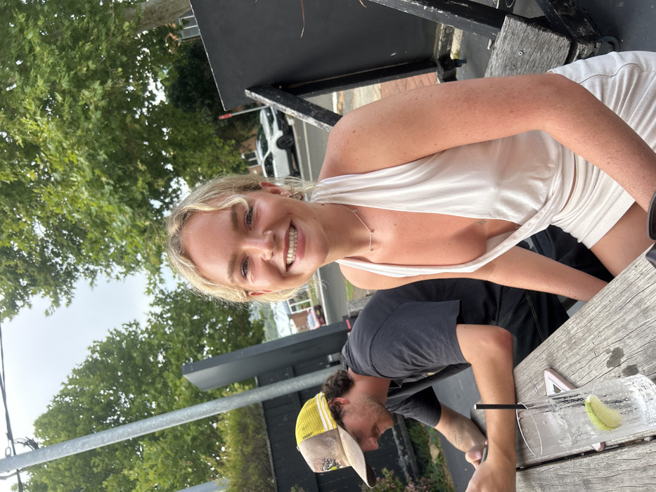A blonde woman, with a nose piercing and wearing a light-colored halter-neck top and matching skirt, smiles directly at the camera while seated at a rustic wooden outdoor table