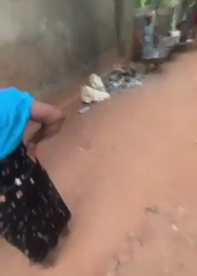 n outdoor scene in what appears to be a rural area. The ground is red dirt. There's a woman wearing a blue shirt and a long dark skirt walking towards a group of children and some wheelbarrows. The children are gathered near a water source, possibly a well or tap, with buckets and containers. There are some brick structures and trees in the background, including what looks like a banana tree. A motorcycle is parked near the woman at the beginning of the video. There is some garbage in the video as well, including what appears to be a burn pile.