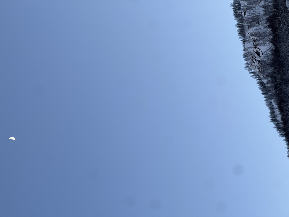 A crescent moon is positioned in the lower-left corner, set against a clear, light blue sky. The upper right edge features a dense line of trees, seemingly blanketed in snow. Scattered blurry patches are visible in the sky, potentially artifacts from the camera or atmospheric conditions. The scene suggests a winter landscape under a crisp sky.