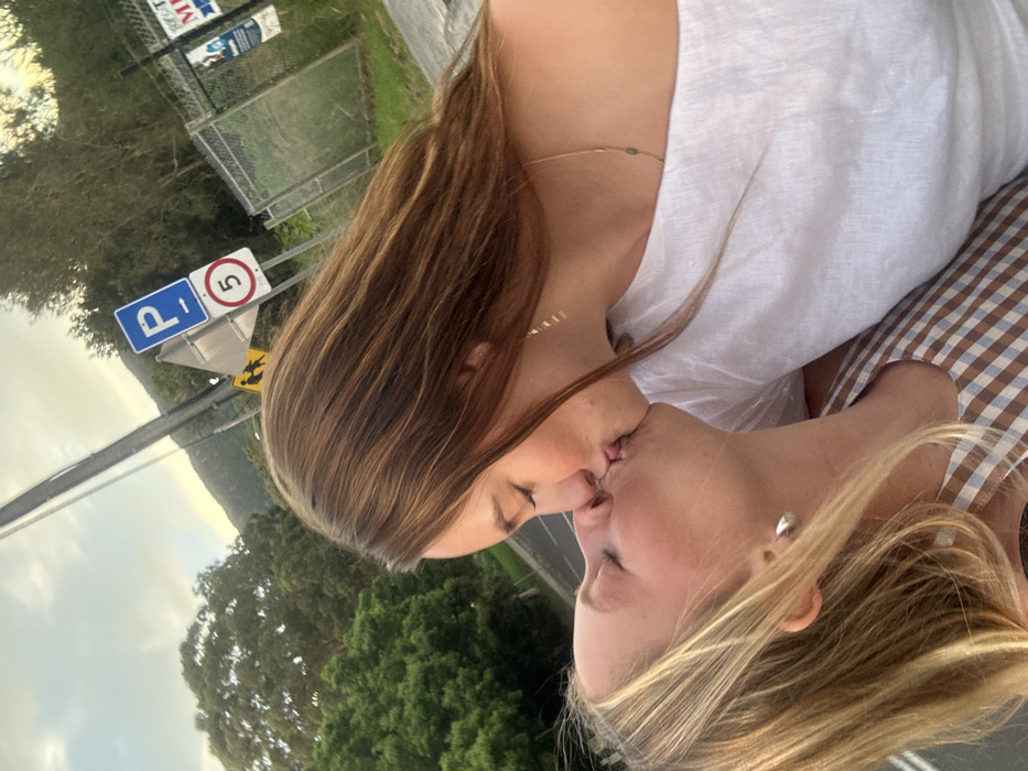 Two young women are depicted in an outdoor, head-and-shoulders profile shot, kissing with their eyes closed