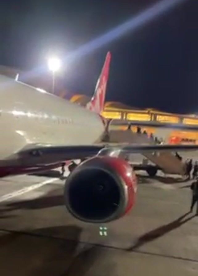 n airplane on a tarmac at night. The plane is white with red accents on the tail and engine. Passengers are disembarking the plane via stairs connected to the aircraft door. Some people are walking away from the plane. The airport terminal is visible in the background, lit up with warm interior lighting. A bright spotlight illuminates the scene near the plane. The ground is concrete.