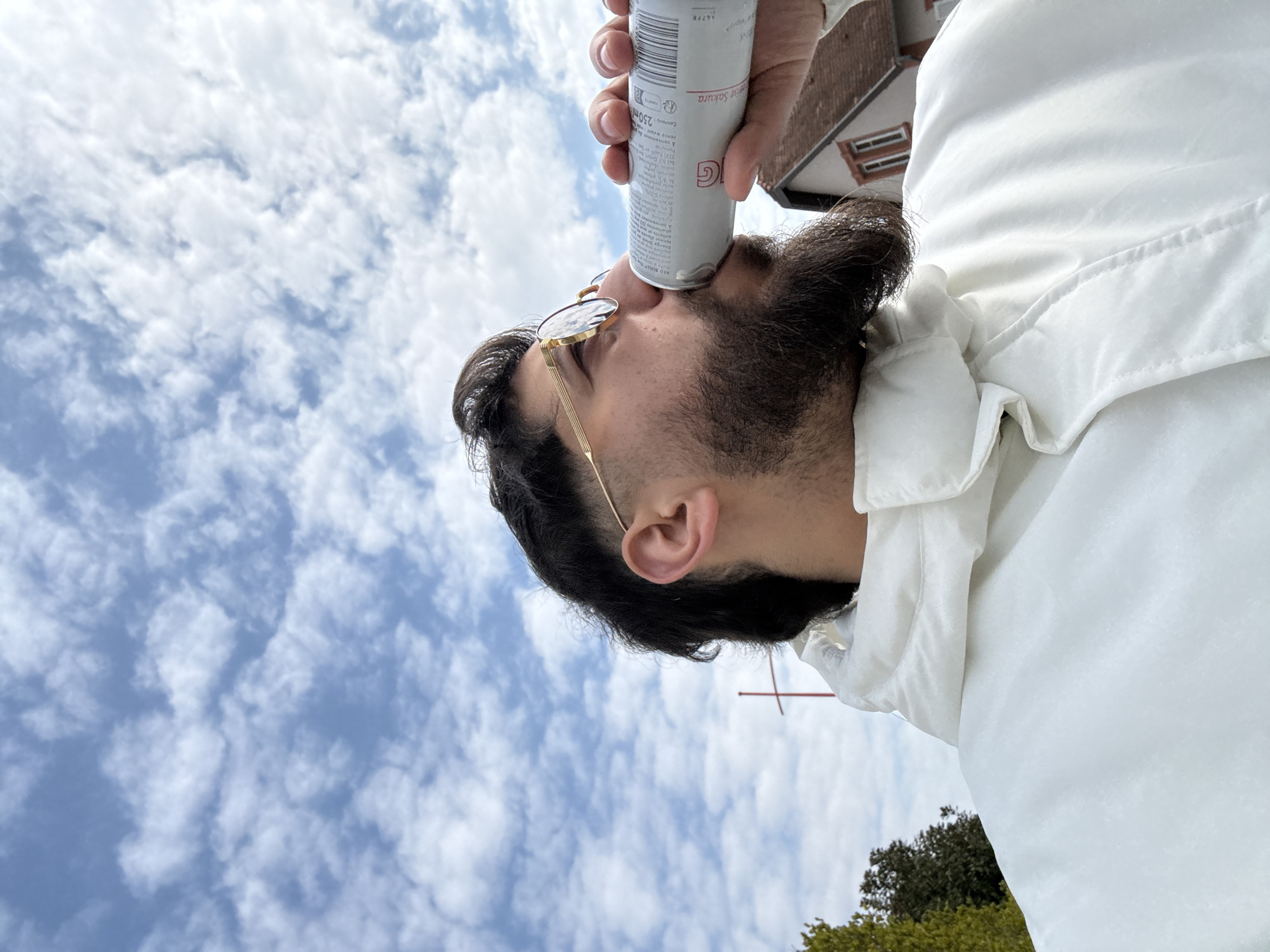 A male individual is depicted outdoors in Lingolsheim, France, in the process of drinking from a beverage can. He is shown from the chest up, with dark hair featuring a fade and longer strands at the back, a full beard, and gold-framed eyeglasses. The subject is wearing a white, high-collared puffy jacket. His right hand holds a silver-colored can, identifiable by visible text as "Sakura" and indicating a volume of "250ml," to his mouth. The background consists of a clear blue sky with scattered white clouds, green foliage from a tree on the far left, and a segment of a light-colored building with a brown tiled roof and white-framed windows on the right. A red, cross-shaped structure is partially visible in the mid-left background.