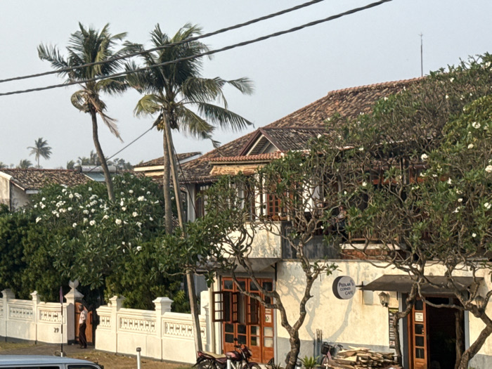 The image depicts an outdoor street scene within Galle Fort, Galle, Sri Lanka, under clear daylight conditions. A prominent two-story building with a reddish-brown tiled roof occupies the right half of the frame. The ground floor houses "Pedlar's Corner Cafe," identified by a circular black and white sign. This building features dark wooden window frames and doors, with an upper-level balcony on which several indistinct human figures are visible. To the left, a white decorative wall with patterned sections and pillars runs horizontally, featuring a gateway marked with the number "29." A single individual, dressed in a light-colored shirt and dark trousers, stands near this gateway, facing towards the right. Two tall coconut palm trees rise prominently in the mid-ground, their fronds extending into the upper portion of the frame, partially obscured by overhead utility lines. Dense green foliage and trees bearing numerous white blossoms are distributed throughout the scene, partially obscuring the buildings. A dark-colored motorcycle is parked near the cafe's ground-level entrance, adjacent to a pile of wooden planks. The front portion of a light-colored vehicle is visible in the bottom-left corner. The sky is pale and largely clear.