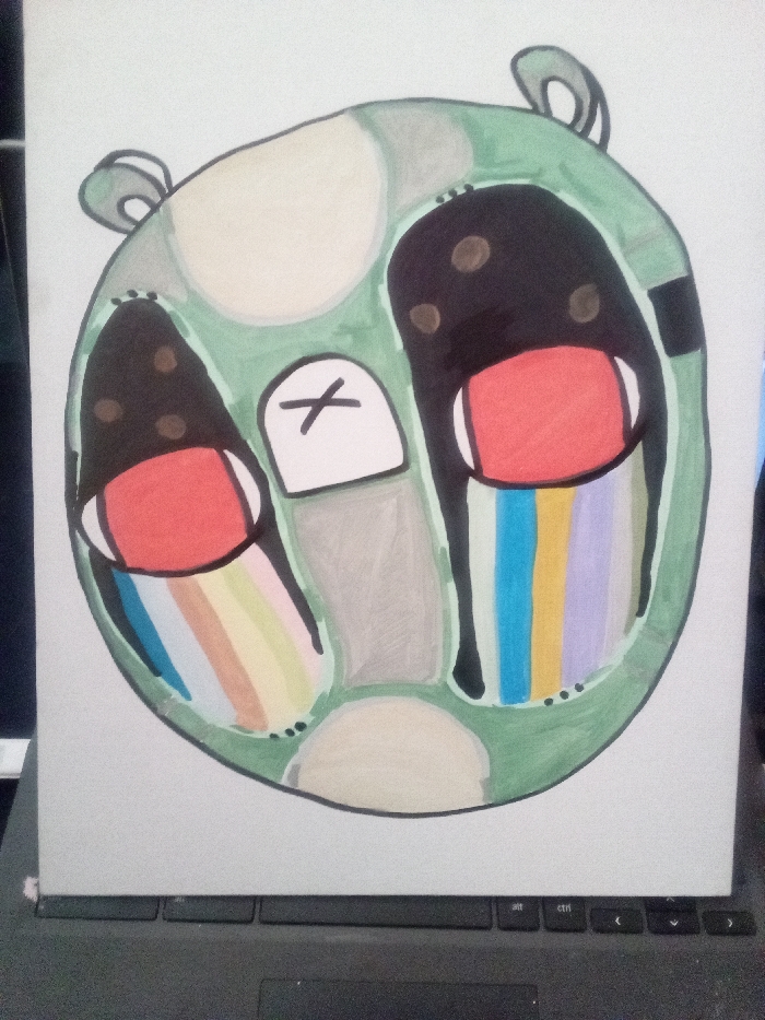 The image displays a colorful drawing on a white sheet of paper, positioned on a black laptop keyboard. The drawing depicts a stylized, round, green character's head, reminiscent of a pig. This character features two large, black, almond-shaped eye areas, each containing three small brown dots. Below these, two prominent red, horizontal, rectangular shapes are present. From beneath each red shape, vertical, multi-colored stripes resembling tears or fluid streaks descend: light blue, light orange, light green, and light brown on the left; light blue, yellow, light purple, and light gray on the right. A central white, rounded rectangular nose-like feature with a black 'X' mark is visible above a gray patch. Two small, gray, rounded ear-like protrusions extend from the top of the head. The entire drawing is outlined in black. The black laptop keyboard, visible at the bottom of the frame, shows discernible keys including 'alt', 'ctrl', and directional arrow keys. The scene is located in Los Angeles, United States.