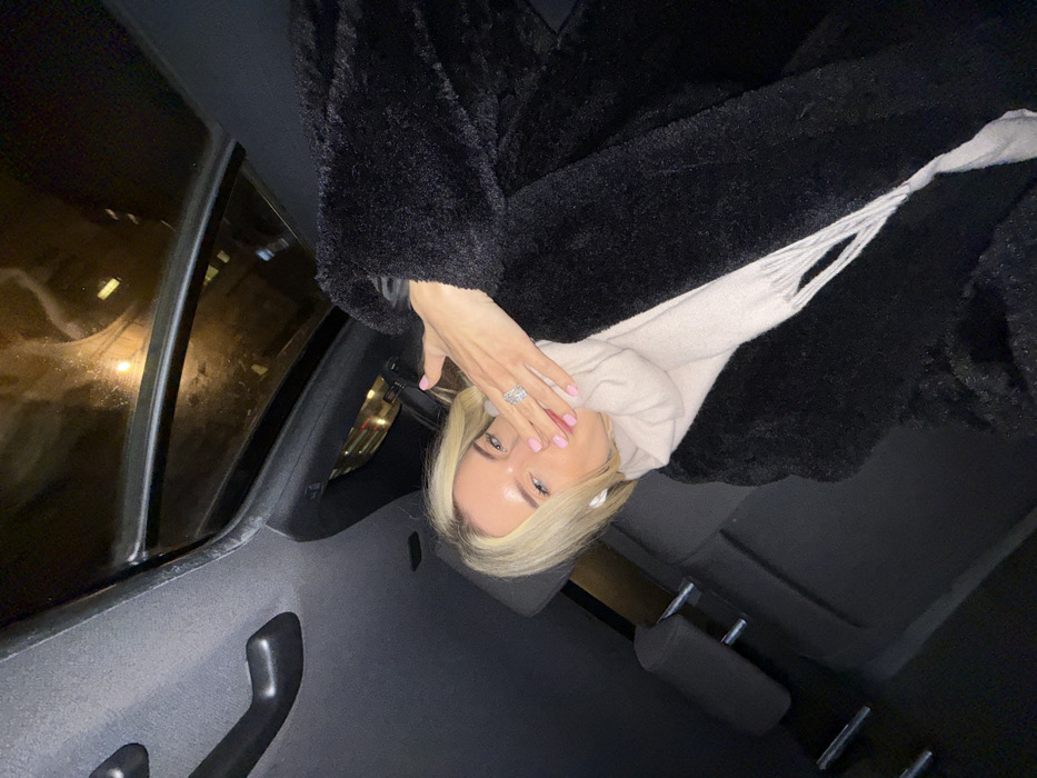 A woman poses in the back seat of a car. She wears a black, fluffy coat and a light-colored scarf. Her blonde hair is visible, and she has a ring on her finger. The car's interior is dark, with a window showing blurred lights outside. The angle is slightly tilted.