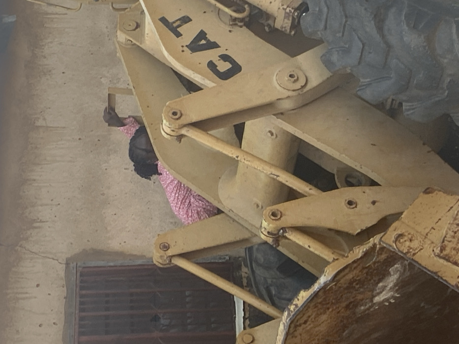 An individual with dark skin and braided hair, wearing a pink patterned long-sleeved shirt, is partially visible interacting with a yellow Caterpillar (CAT) heavy machinery, likely a front-end loader, in Bukuru, Nigeria