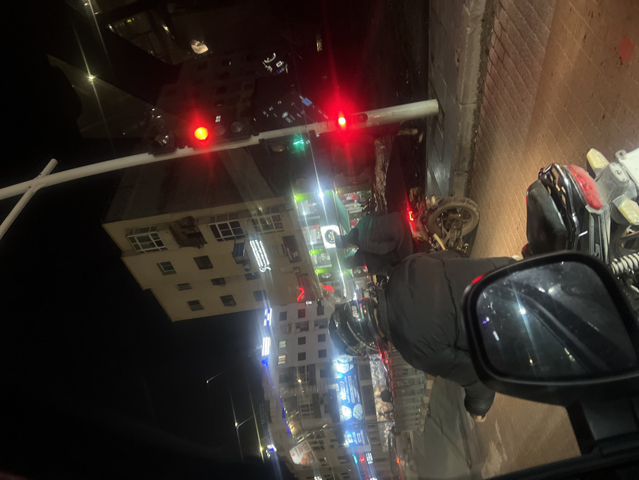 A street at night features a building with lit windows and neon signs. A traffic light overhead displays red. Several people are standing or sitting near motorcycles parked on the sidewalk. The perspective is from within a vehicle, with a side mirror visible. The scene has a bustling urban feel, illuminated by artificial lights in the darkness.