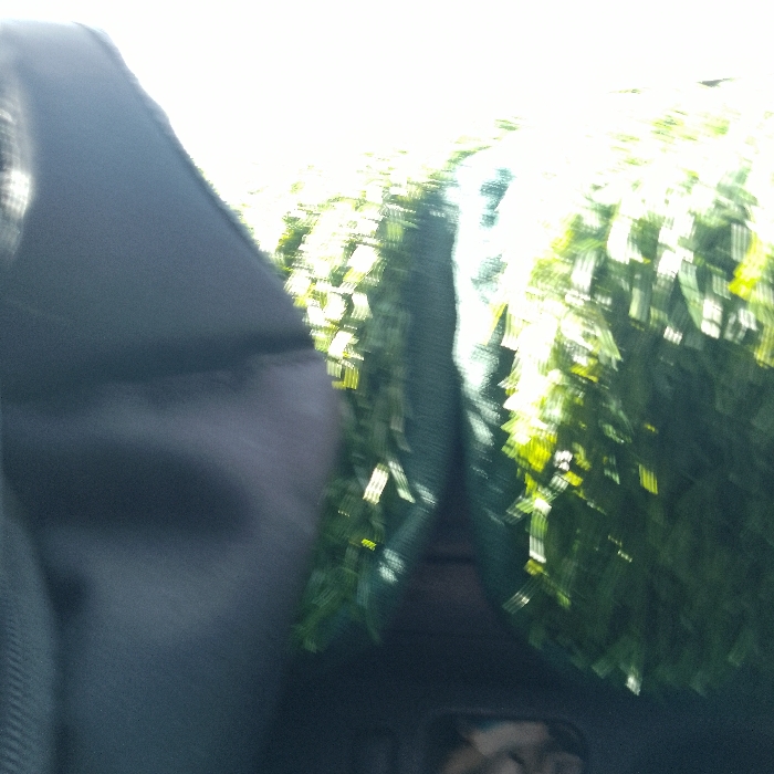 The image presents a heavily motion-blurred and overexposed outdoor scene, likely viewed from within a moving vehicle