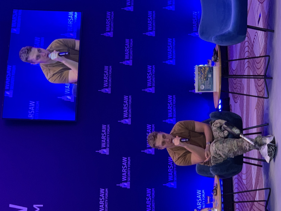A male individual is seated in a dark blue upholstered armchair, speaking into a black microphone, within a venue identified as the Warsaw Security Forum in Warsaw, Poland