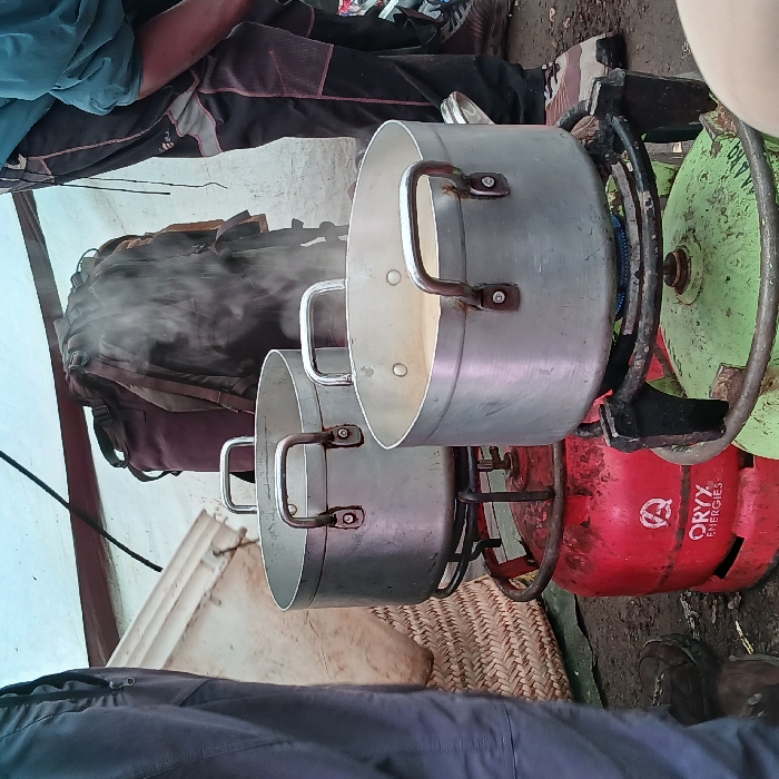 - "Within a light-colored canvas shelter at Gilman's Point, Tanzania, two large, silver-colored aluminum cooking pots are centrally positioned, actively heating" by FM-tjCYg2, licensed under CC BY 4.0
