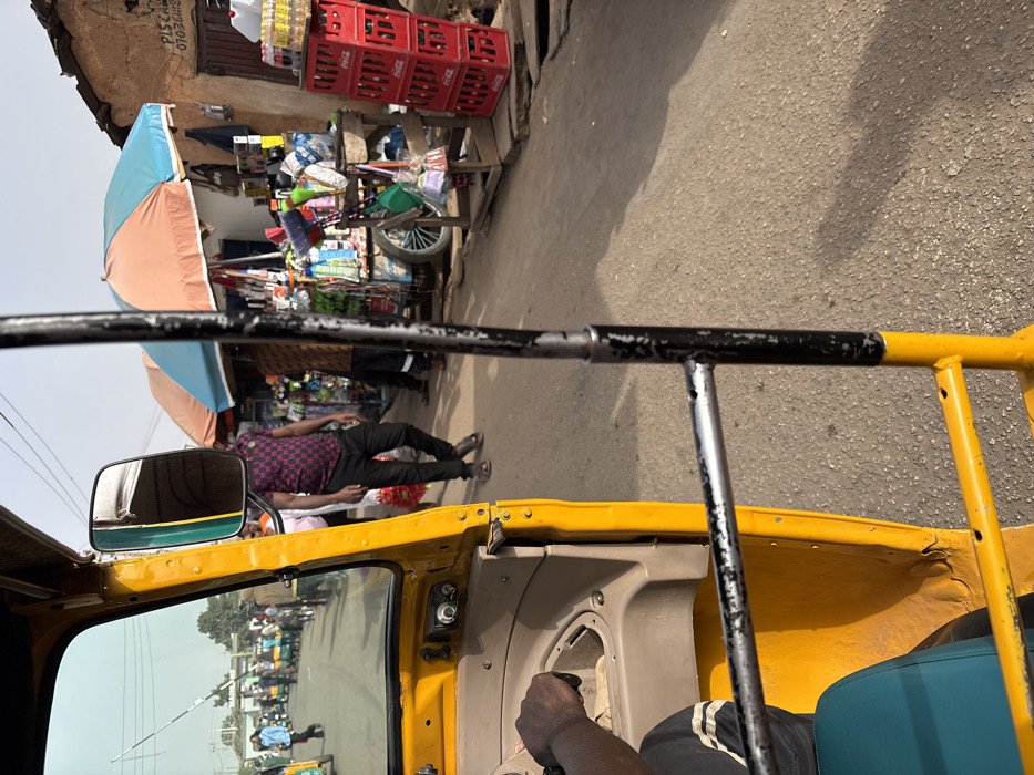 From inside a yellow three-wheeled vehicle, the view presents a street scene