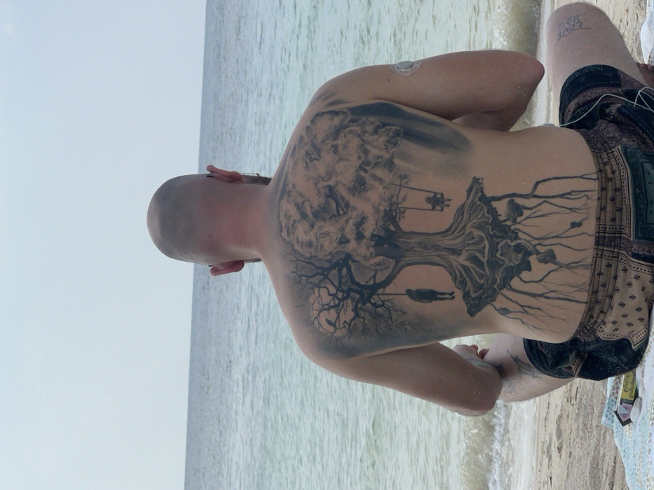 A bald man sits at the beach facing away from the camera. He has a large tattoo of a tree that covers most of his back. The tree has two figures suspended from its branches; a pair swinging and a single figure hanging. Roots stretch to the right side of his back. He is wearing patterned shorts. The water and beach are visible in the background.
