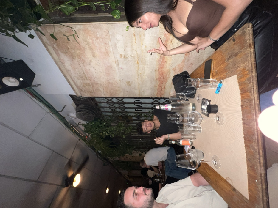 Several people are seated at a long wooden table, littered with empty glasses, a water bottle, a lighter, and a small black bag. A woman with long dark hair, wearing a brown top and black pants, gestures with her hands. A man in a black shirt is visible near the center of the table. Another man with a beard is at the end of the table. Outdoor lighting and green plants are seen in the background.