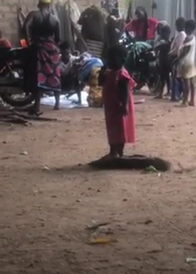 group of people in an outdoor, somewhat impoverished-looking setting. In the foreground, a young girl in a pink dress stands on what appears to be a pile of dirt or rubble. Behind her, several other children are gathered together, some looking towards the girl in pink. Further back, an adult woman wearing a wrap-around skirt is standing and appears to be interacting with someone out of view. To her left, another figure is crouched down, possibly working on something. In the background, there's a motorcycle parked near a building constructed with cinder blocks and corrugated metal. The ground is dirt, and there are scattered objects and debris around. The overall impression is a scene of daily life in a developing country or rural area.