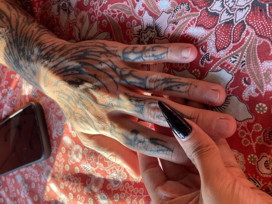 The scene, located in Tambon Ko Tao, Thailand, is an overhead close-up view illuminated by natural light. It features two hands resting on a red fabric adorned with a repeating floral and leaf pattern in red, pink, white, and blue. A right hand, seen from the dorsal side, is extensively covered with black and dark grey abstract, organic tattoos across its back and fingers. Its fingernails are short and unpolished. A left hand is positioned to gently touch or hold the pinky and ring finger area of the tattooed hand. The index finger of the left hand is prominent, displaying a long, glossy black, sharply pointed artificial nail. In the upper left background, partially obscured, rests a black smartphone within a protective case.
