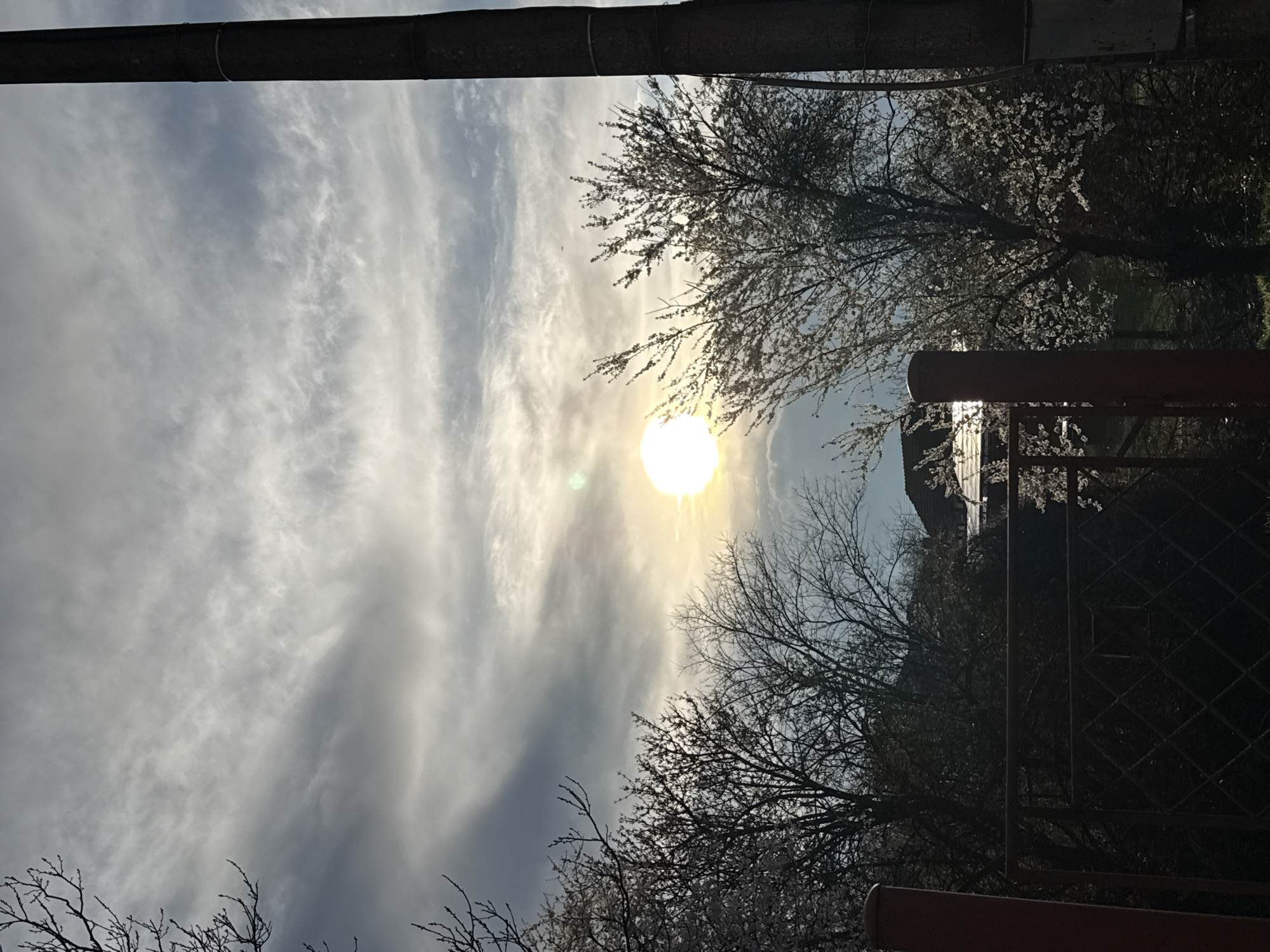 The image presents an outdoor scene in Trudovets, Bulgaria, featuring a bright sun obscured by thin clouds in a partly cloudy sky. A thick, dark-colored pole runs along the top of the frame. Below the sun, branches from trees with white blossoms are visible. To the right, a portion of a house can be seen behind a dark fence and more trees. The image is oriented with the original horizon rotated to the left.