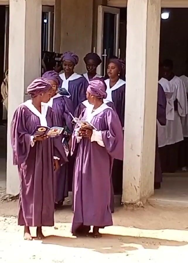 Several people stand in or near the entrance to a building. The people in the foreground are wearing purple robes with white collars and purple head coverings. They appear to be reading from small booklets in their hands. Behind them, others are standing in the doorway, some wearing purple robes and others wearing white shirts. The building has a series of arched doorways and concrete pillars. The ground outside the building is dirt. Some filming equipment is visible, indicating a recording is taking place.