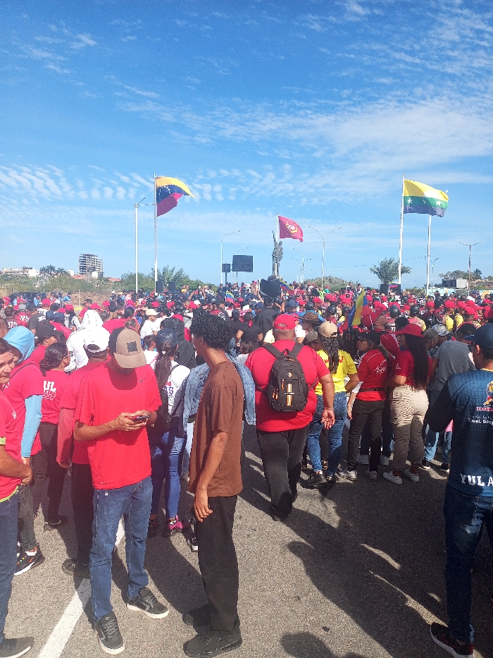 A dense public gathering is observed under a clear blue sky with wispy clouds, characteristic of an outdoor event on a sunny day. The scene unfolds on an asphalt surface, likely a public street or plaza, indicated by white line markings on the pavement. In the middle ground, a prominent monument featuring a standing figure raising an object is visible, flanked by tall light poles. Overhead, three flags are displayed on poles: the national flag of Venezuela (yellow, blue, red with stars), the state flag of Nueva Esparta (yellow, green, blue with stars), and a solid red flag bearing an indistinct emblem. The crowd consists of numerous individuals, predominantly adults, congregated closely together. A significant number of participants wear red t-shirts, suggesting a unified affiliation, though some wear other colors like yellow, brown, and various shades of blue. Many individuals wear baseball caps. People are seen standing, walking, and generally occupying the space. In the foreground, a man wearing a red t-shirt and a beige baseball cap is engrossed with a mobile phone. Another man in a brown t-shirt stands nearby, facing left. Shadows cast by the crowd and structures are visible on the asphalt, indicating the sun's position. The background reveals distant buildings and some sparse vegetation, consistent with an urban environment. This event is located in Porlamar, Venezuela, likely at a major public thoroughfare or square, such as Avenida 4 de Mayo or a similar central area, given the presence of the state flag and a substantial monument.