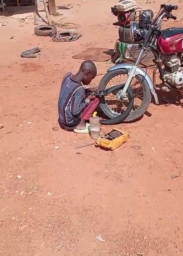 - "boy sitting on the ground, working on a motorcycle tire" by FM-12xFB3, licensed under CC BY 4.0
