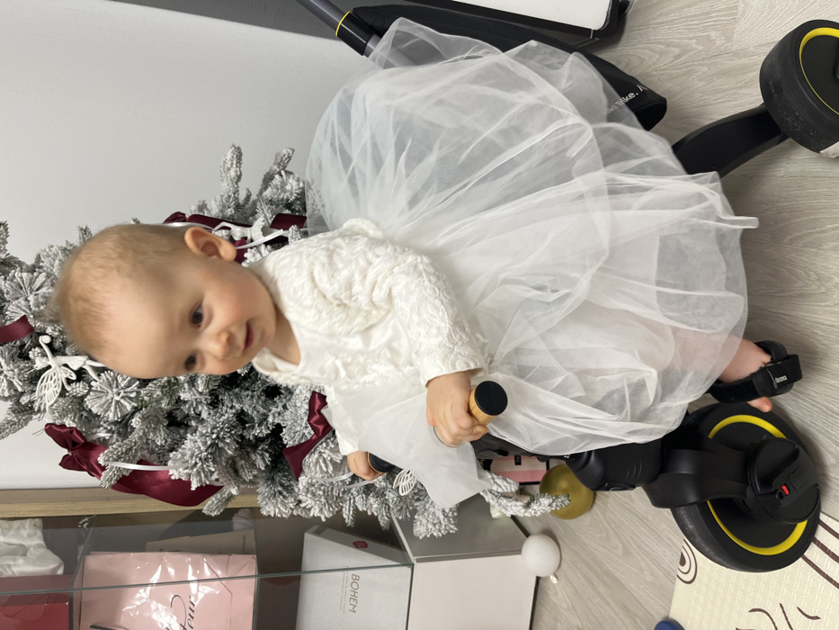 A baby in a fluffy white dress sits on a black tricycle with yellow accents. The child is positioned near a decorated Christmas tree with silver foliage and burgundy ribbons. The baby is holding onto the tricycle's handlebar, appearing to steer. Beneath the tree, are boxes, including one labelled "BOHEM". The scene is indoors, likely in a home.