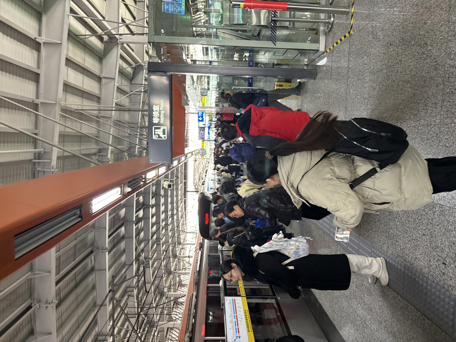 A crowded train station platform is visible. Passengers are lined up, close to the train. Most are wearing coats. One woman in the foreground wears a black coat and white boots. Another woman wears a beige jacket with a black backpack. Above the platform are steel structural supports and a sign that reads "Waiting Room." Part of the train is visible with yellow and blue designs. The scene has a busy, travel-related atmosphere.
