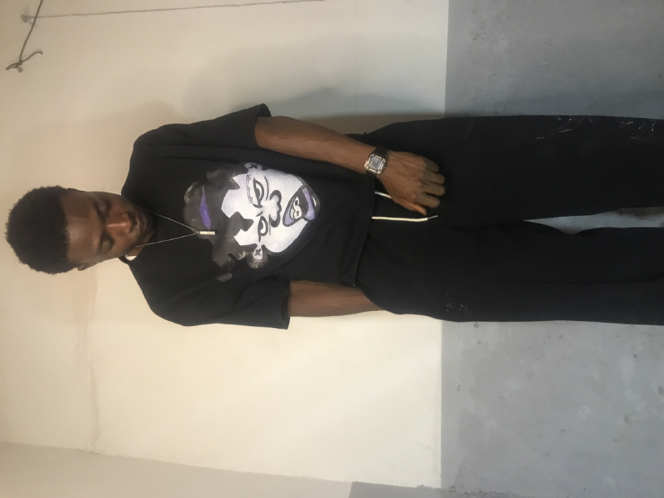 An indoor scene depicts a male individual, appearing to be of African descent, standing against a two-toned wall. The specific location within Kirana, Nigeria, is not discernible from the visual evidence. The upper portion of the wall is light grey or off-white, while the lower section, starting approximately at the subject's hip level, is a darker grey. A faint vertical seam or corner is visible on the light wall to the subject's left. A thin, dark, wire-like object extends from the upper right corner of the frame. The individual is oriented slightly to his left, with his head tilted downwards, obscuring a clear view of his face. He has short, dark hair. He wears a short-sleeved black t-shirt featuring a large, stylized graphic of a cartoon-like face, predominantly white with black outlines and purple accents on the hair/headband and lips. A silver-colored chain with a rectangular pendant hangs around his neck. He is dressed in black sweatpants with a visible white drawstring at the waist. A watch with a dark strap and metallic case is present on his left wrist. His right hand is partially inserted into his pants pocket, and his left hand rests by his side, touching his left thigh. No other individuals or active interactions are depicted.