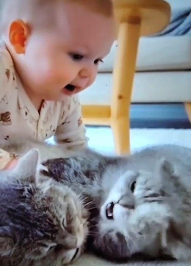 A close shot captures a baby and two cats on a beige carpet indoors. The baby, dressed in a light-colored pajama set with patterns, is in the foreground, positioned at the top of the frame and leaning towards the cats. The baby's face expresses a mixture of curiosity and distress, with an open mouth. Two grey tabby cats are lying on the carpet below the baby. One cat is curled up with its head tucked in, while the other is lying on its back with its eyes open and looking up. Behind the baby and cats, a small, round wooden table with a plant on top is visible, adding depth to the scene.