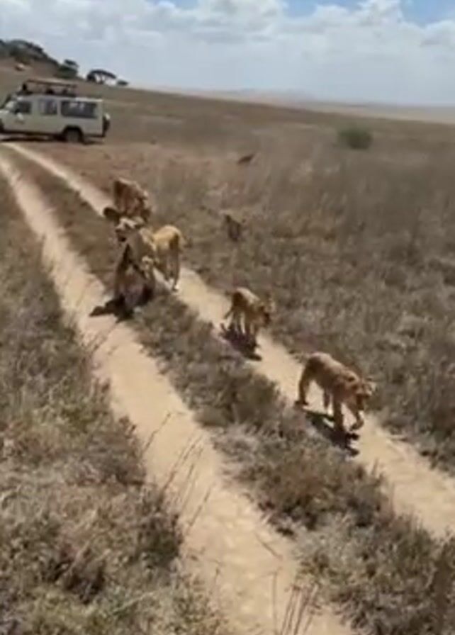 pride of lions walking along a dirt road in a grassy plain