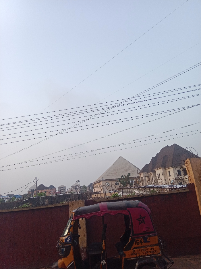 A partly visible yellow and maroon auto-rickshaw sits near a reddish-brown wall. Beyond the wall, a skyline of various buildings is visible under an overcast sky. Among the buildings are distinct architectural styles including a pyramidal structure and several houses with brown roofs. A web of overhead electrical wires cuts across the sky. Barbed wire tops the wall, adding a layer of security.