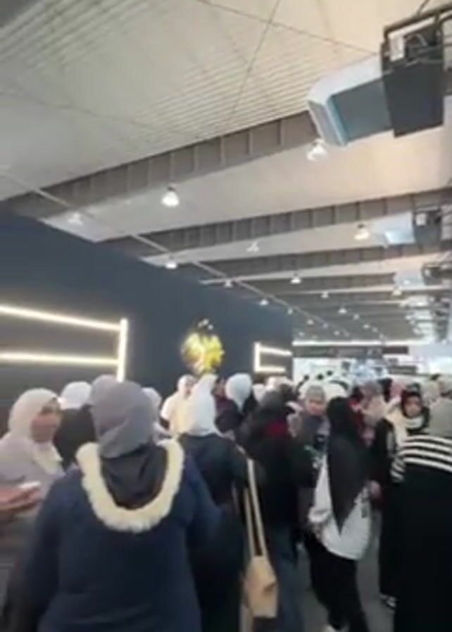 crowded indoor space with a high ceiling, likely a convention center or large hall. The area is brightly lit by overhead fluorescent lights and occasional spotlights. Many people, predominantly women wearing headscarves, are walking and milling about. Most of the individuals are dressed in casual winter clothing. The flooring is a combination of carpet and hard flooring. There's a dark colored booth with neon lighting and some branding elements visible, drawing the attention of passersby. The crowd's movements seem casual, suggesting people are browsing and exploring the area.