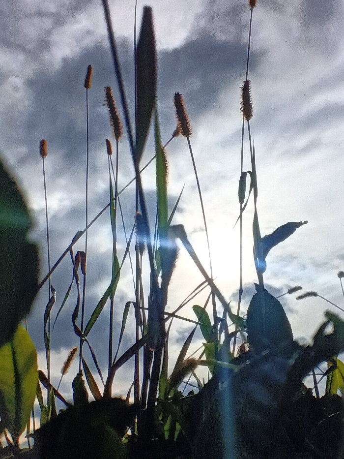 The image depicts a low-angle view of dense, tall vegetation silhouetted against a bright, cloudy sky in an undisclosed outdoor location within the city of Unknown, Unknown. No human subjects or man-made objects are present. The foreground and midground are dominated by various plants. Multiple slender, erect stems, some with narrow leaves, rise vertically, terminating in distinctive cylindrical, reddish-brown inflorescences or seed heads, indicative of tall grasses or weeds. Some broader, darker leaves are visible at the bottom and sides, partially obscuring the lower stems. The vegetation is primarily dark green to black due to backlighting. The background shows a partly cloudy sky, with significant bright glare from a low sun positioned centrally behind the plant cluster. This strong backlighting creates prominent silhouettes of the plants and results in a distinct blue and white lens flare emanating from the light source. The clouds are a mix of white and grey tones. The scene suggests a daytime environment, possibly early morning or late afternoon, characterized by natural elements and atmospheric conditions.
