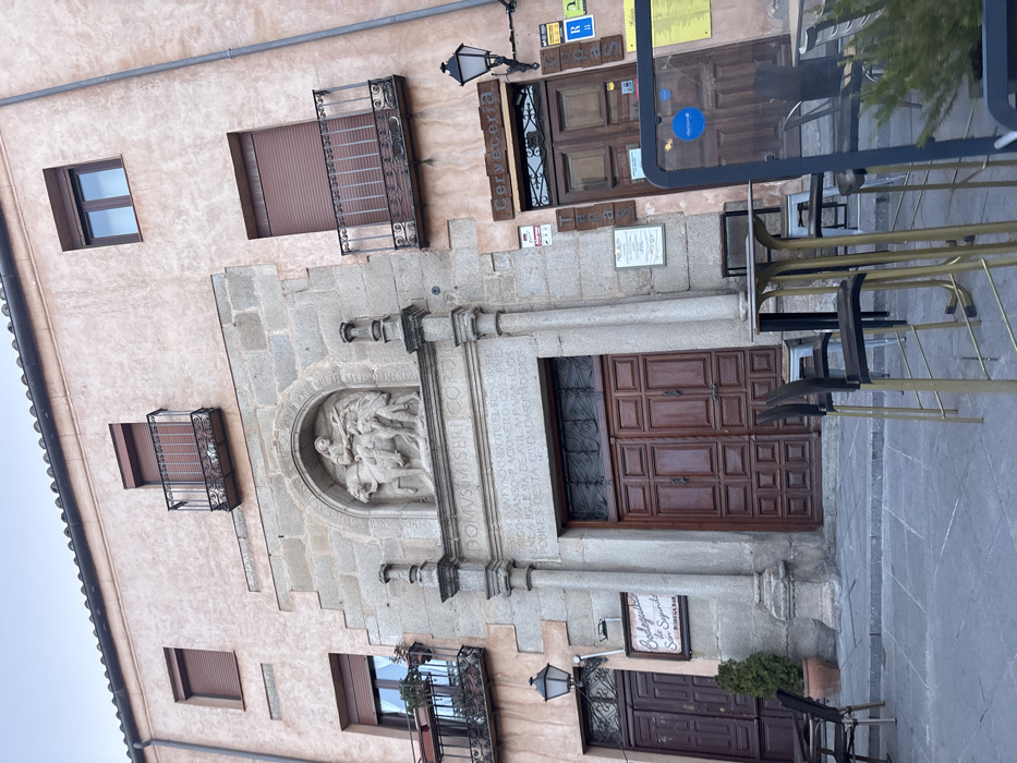 The image displays the facade of a multi-story historic building in Ávila, Spain, centered around a stone entrance portal